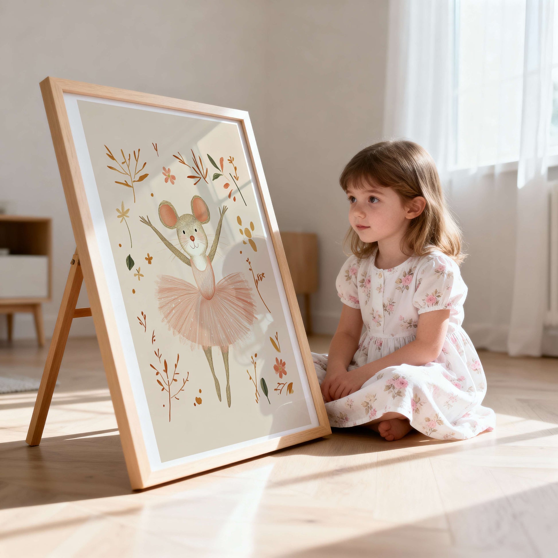 This delightful illustration features a tiny mouse dressed in a soft ballet tutu, dancing joyfully with arms raised among delicate floral details. The gentle movement and sweet expression capture a sense of confidence, creativity, and playful imagination.