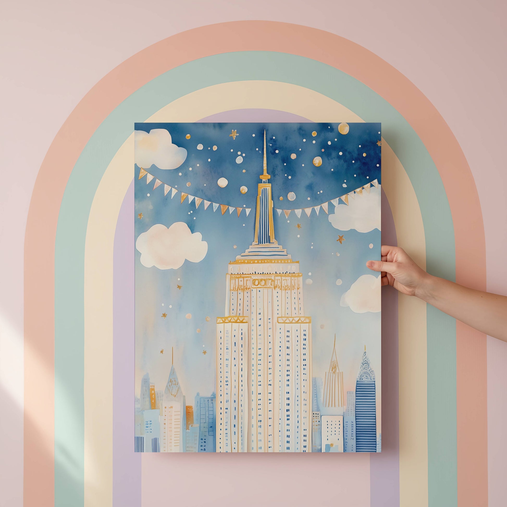 Celebrate one of New York’s most iconic landmarks with this Empire State Building art print, illustrated in soft watercolours and warm, calming tones. Designed with a child-friendly, story-led style, this piece captures the magic of the skyline without feeling overwhelming.