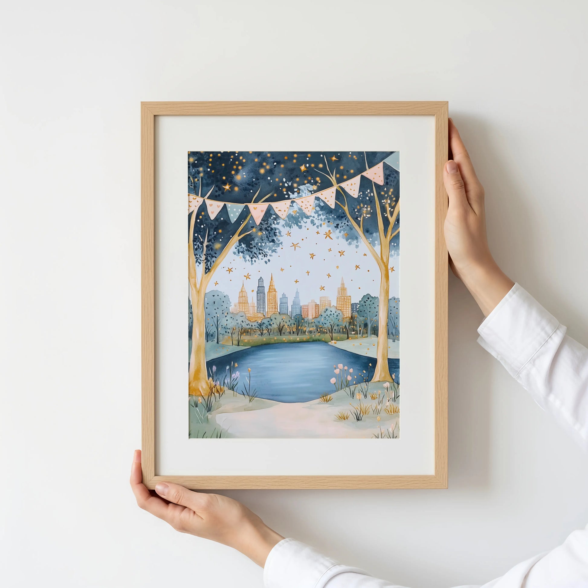 This Central Park art print brings a peaceful slice of New York City into your home, illustrated in soft watercolours with gentle greenery and skyline details beyond. It captures the calm, storybook side of the city where nature and imagination meet.