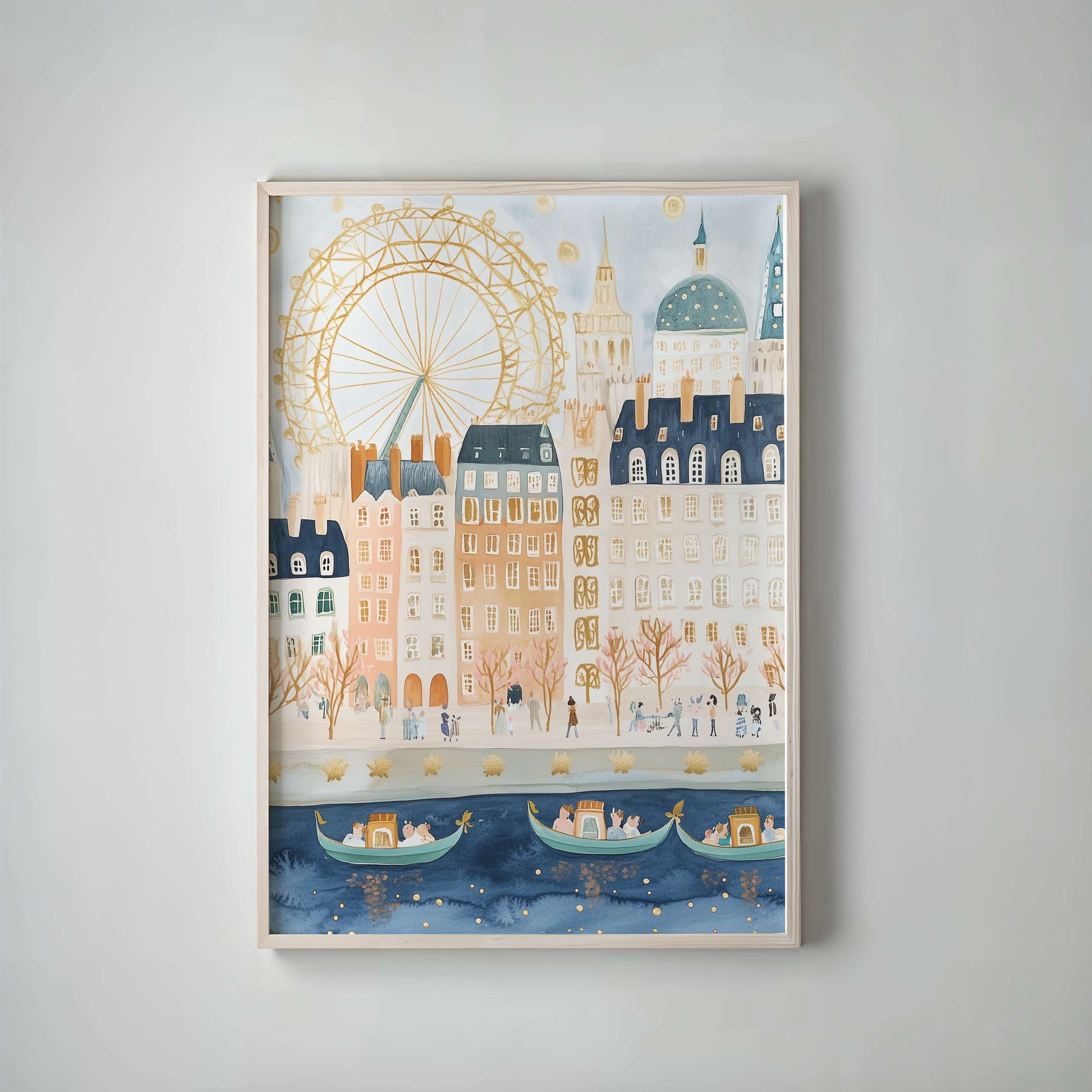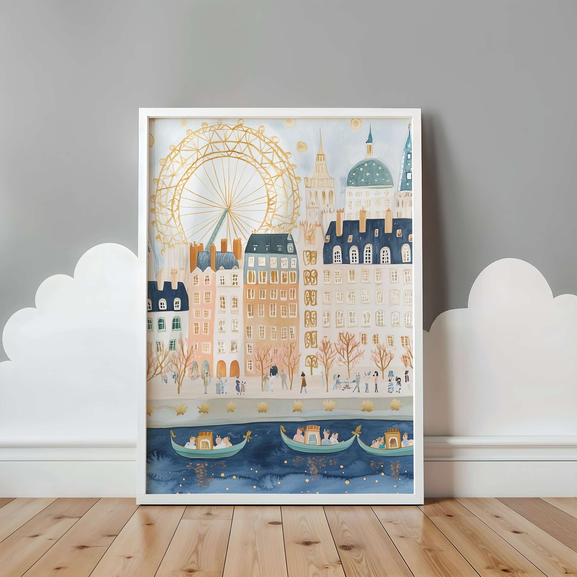 Bring the magic of London into your space with this London Eye art print, illustrated in soft watercolours and warm, calming tones. Featuring the iconic London Eye rising above charming city buildings and gentle riverside details, this piece captures the wonder of the city in a child-friendly yet timeless style.