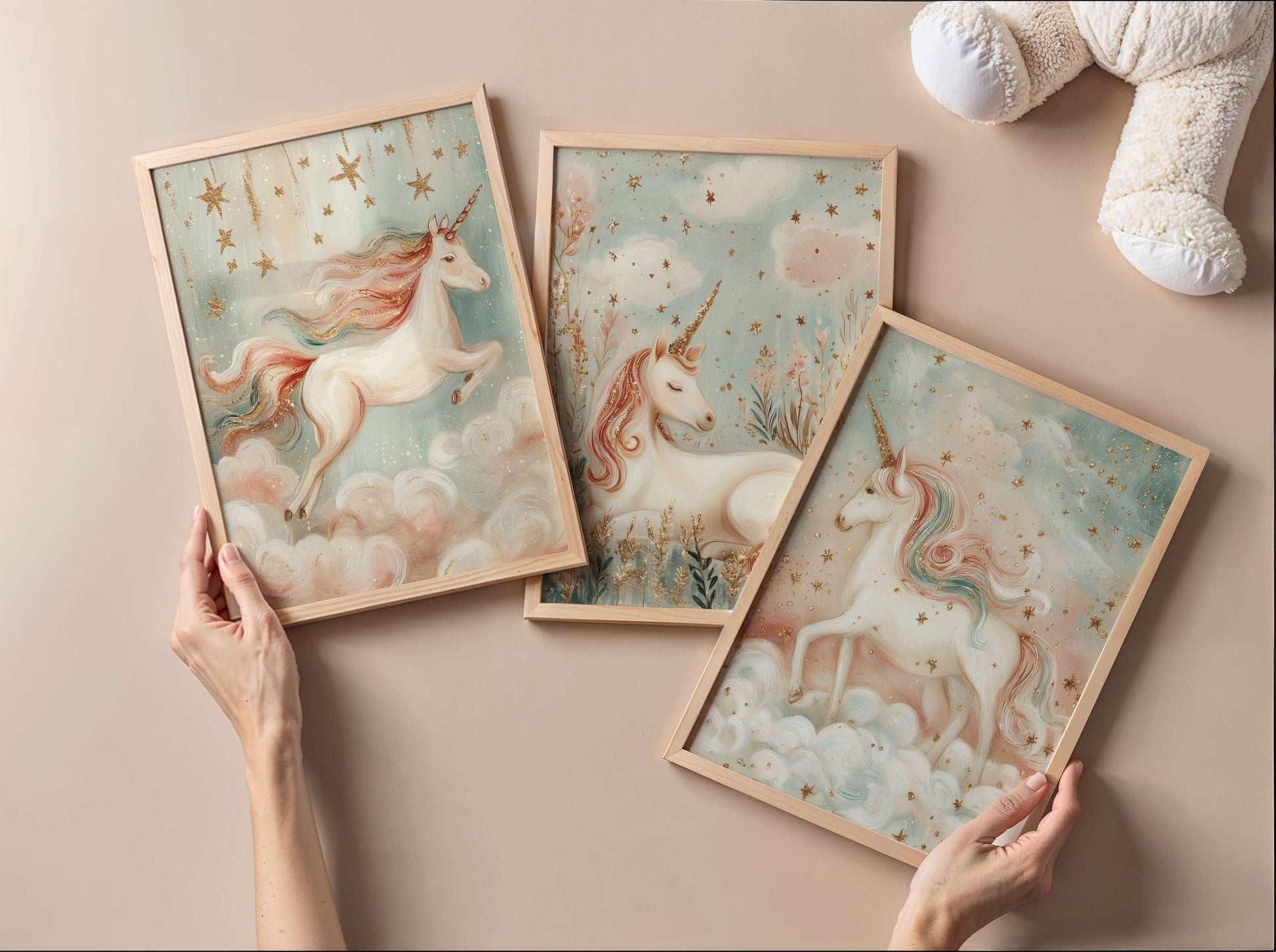 - Artwork Name: Pastel Unicorn Wall Art Set of 3 Prints