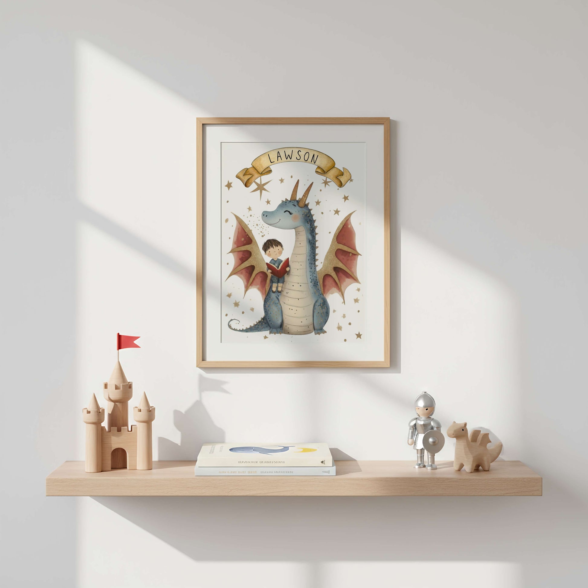 This personalised dragon print features a storybook-style illustration of a young boy reading while perched on the shoulder of his dragon companion, finished with a custom name for a meaningful personal touch. Designed to celebrate imagination, friendship, and a love of stories, it brings warmth and charm to boys’ bedrooms and reading spaces.