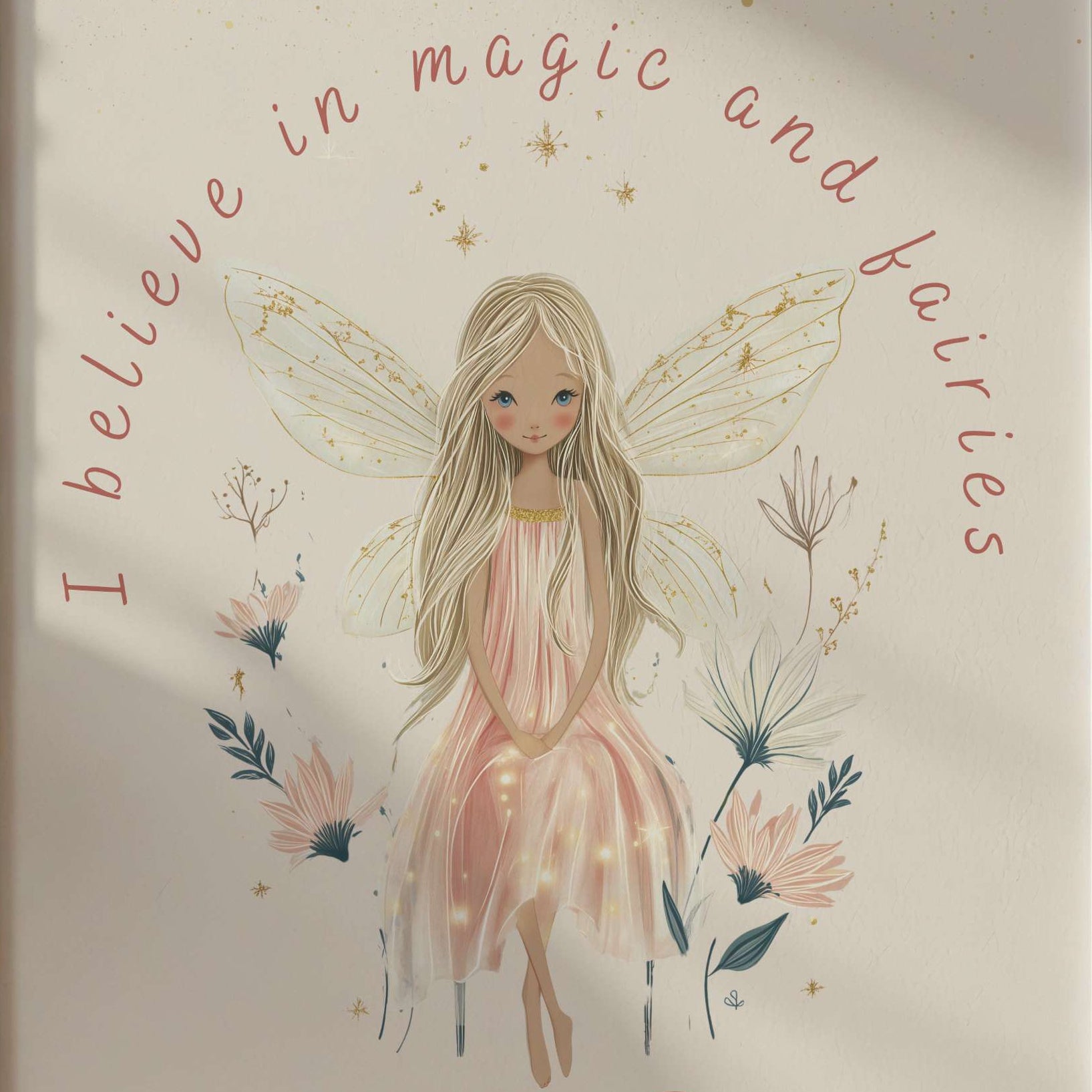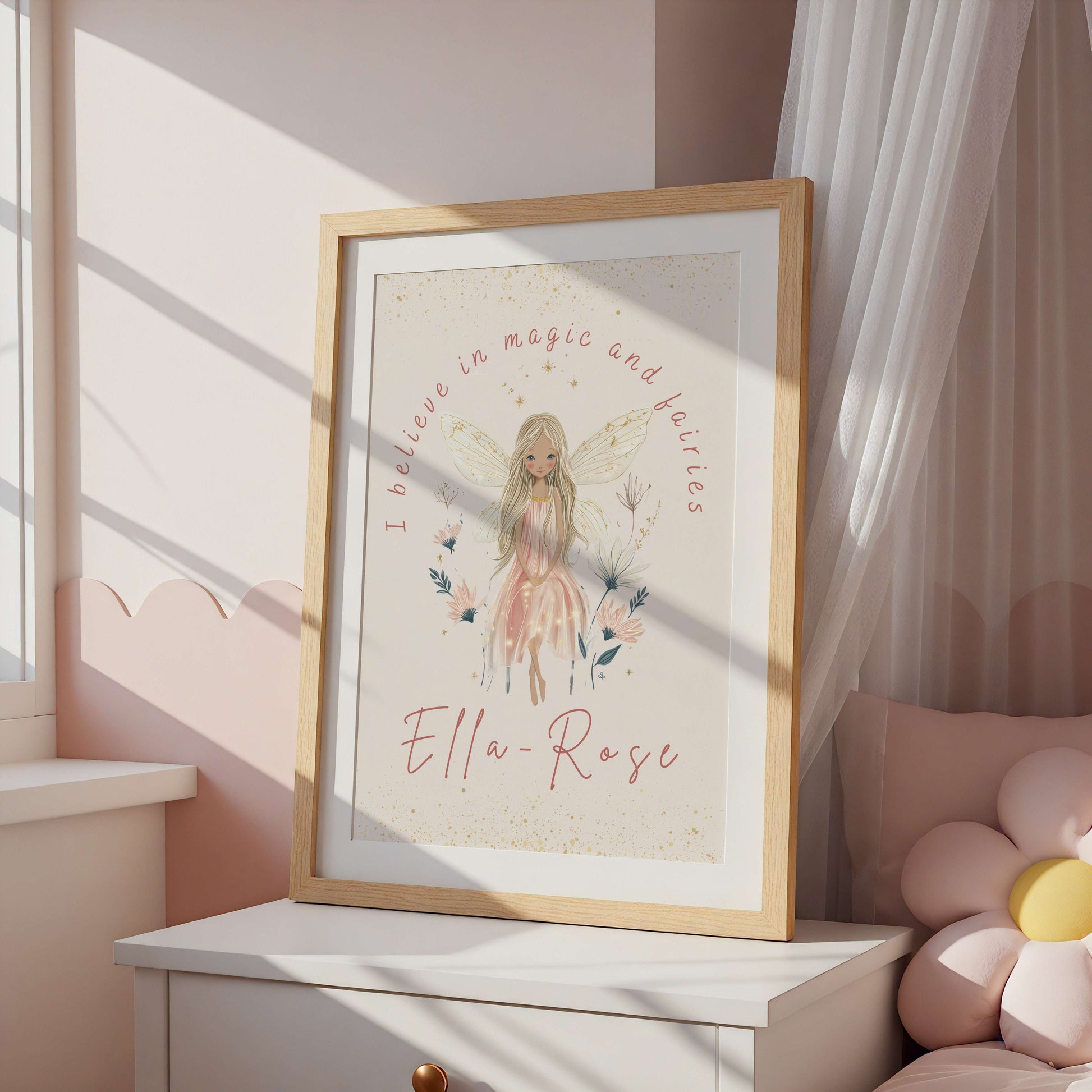 Add a touch of gentle magic to her space with this personalised fairy quote wall art "I believe in magic and fairies" , featuring a soft fairy illustration and an uplifting storybook phrase.