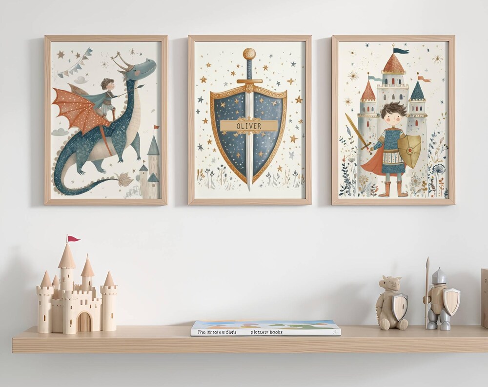 This print can be purchased on its own or as part of a coordinating three-piece knight set, including a dragon-riding knight and a knight standing outside a castle. It also pairs beautifully with other designs from the wider dragon and knight collection, making it ideal for creating a cohesive gallery wall.