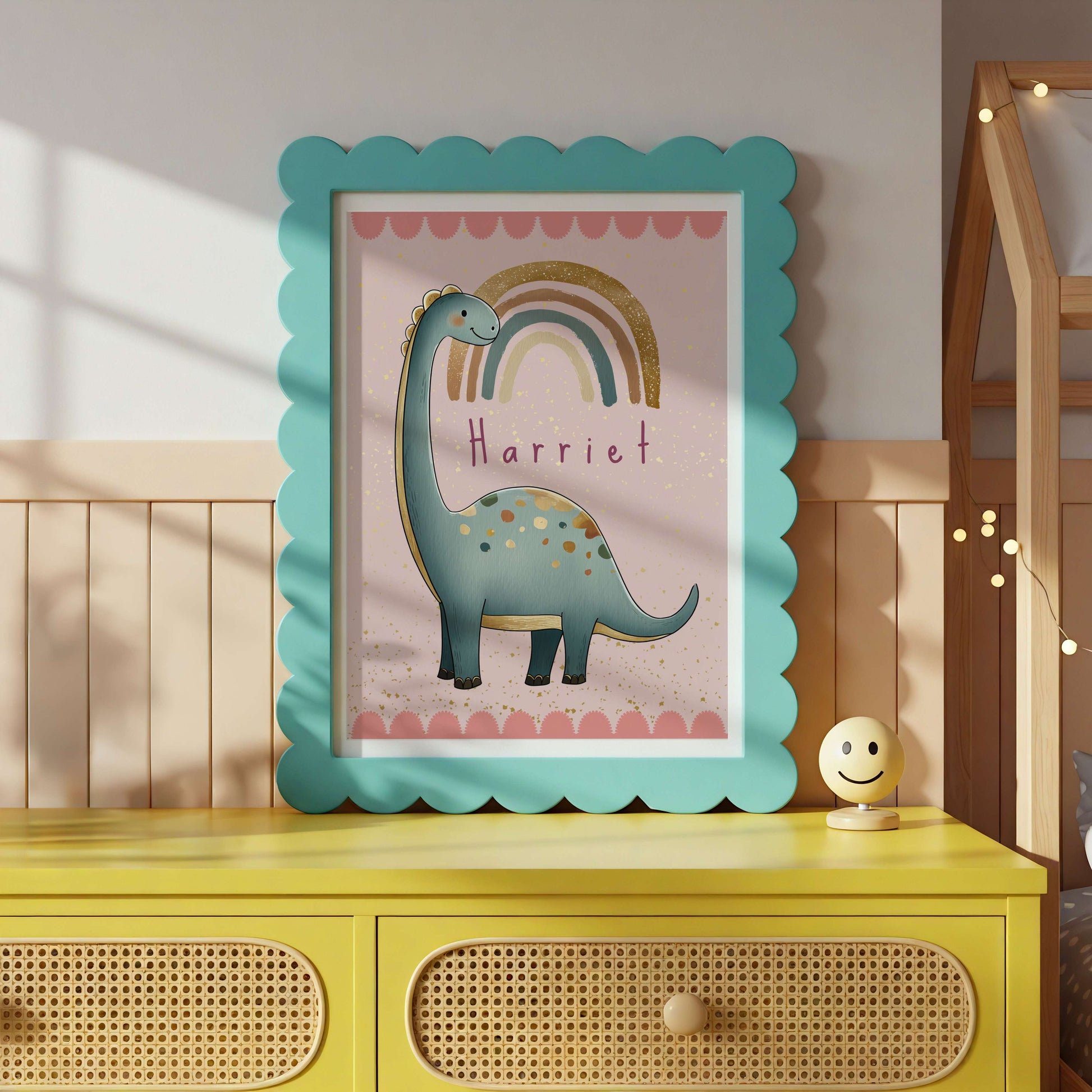 This personalised pink dinosaur print features a friendly dinosaur illustration paired with a soft rainbow and a custom name design, creating a playful yet calming piece of wall art. Designed to bring warmth and personality to nurseries, bedrooms, and play spaces, it blends whimsical charm with a timeless colour palette.