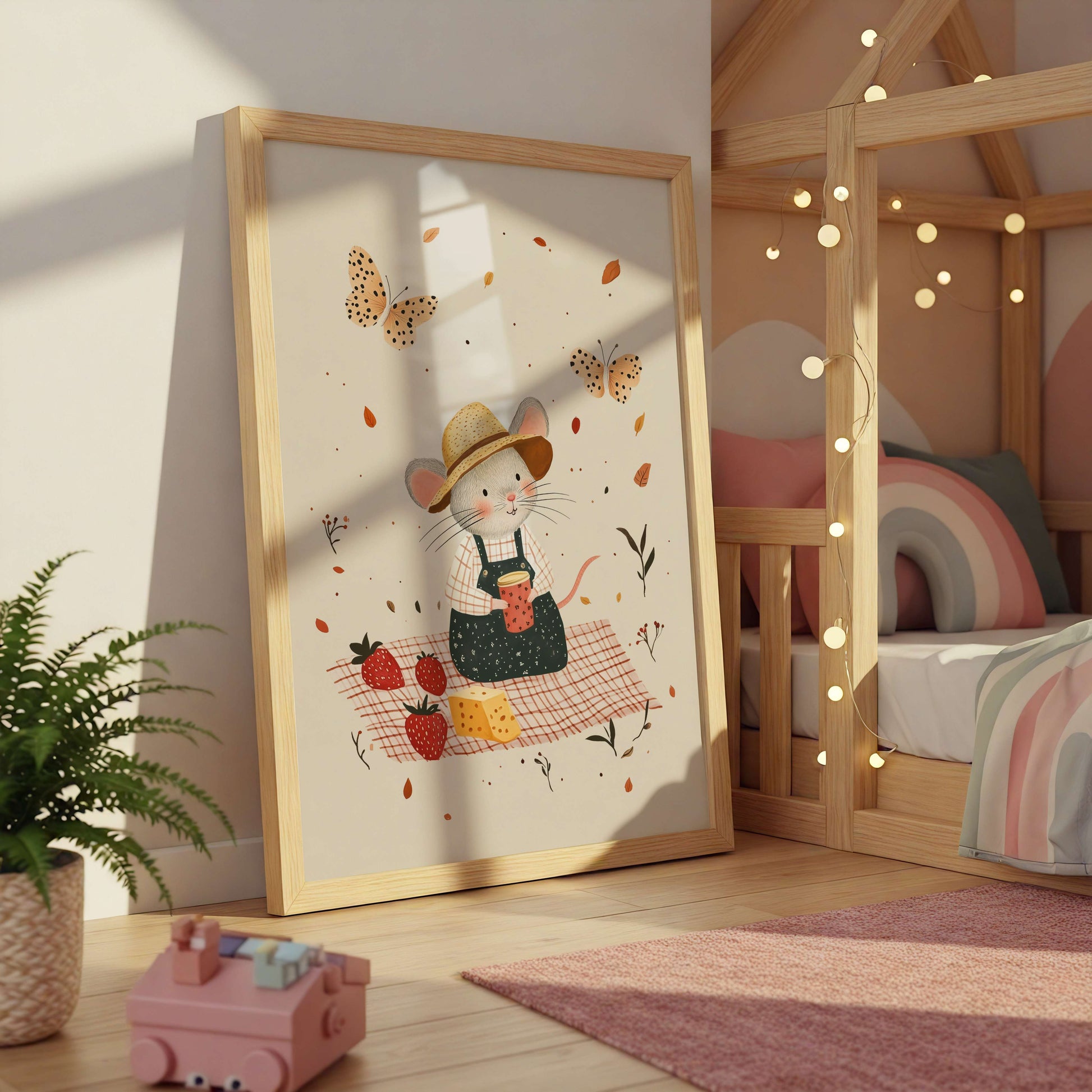 Add a gentle touch of outdoor charm to your child’s space with this picnic mouse print.